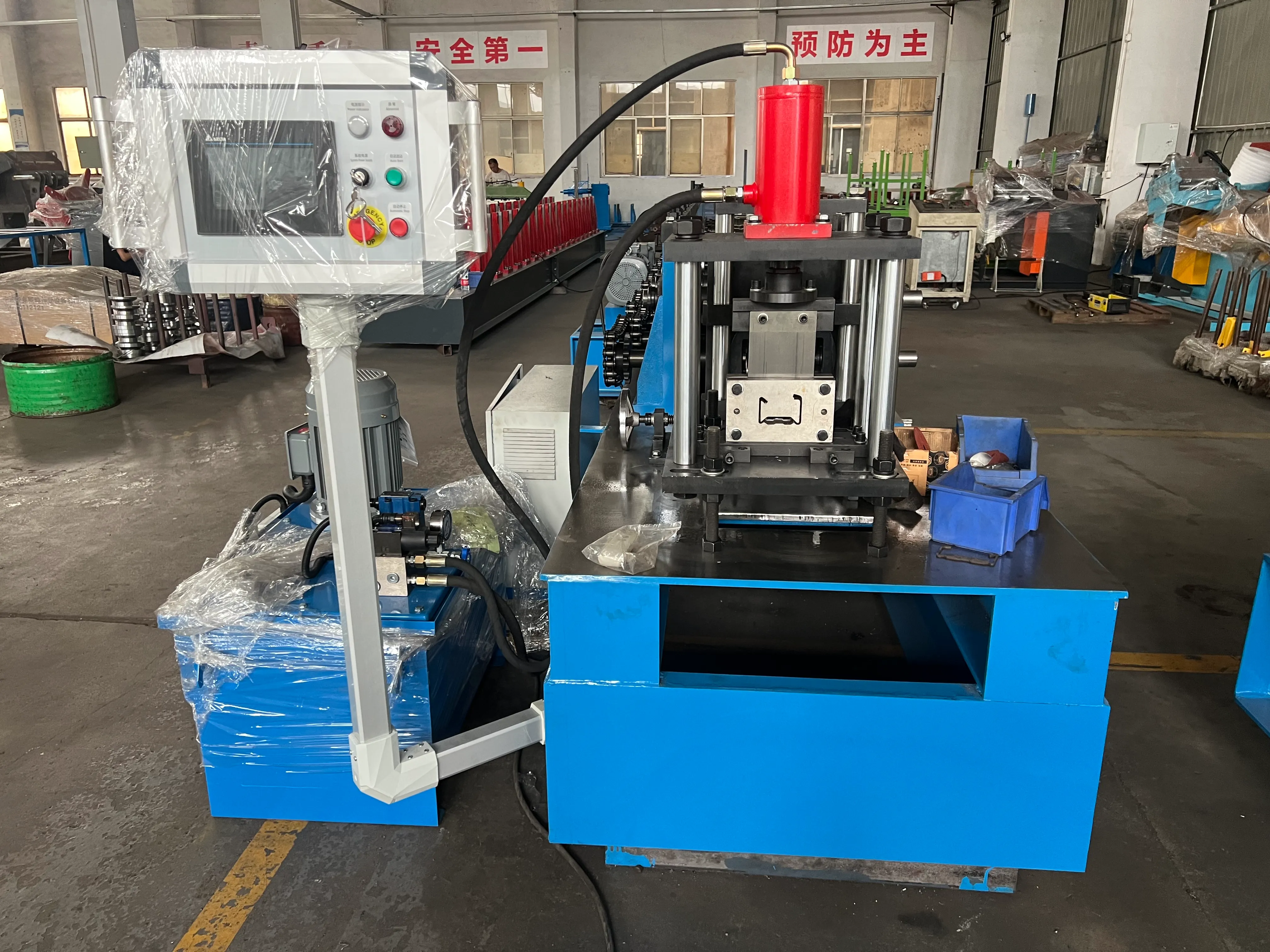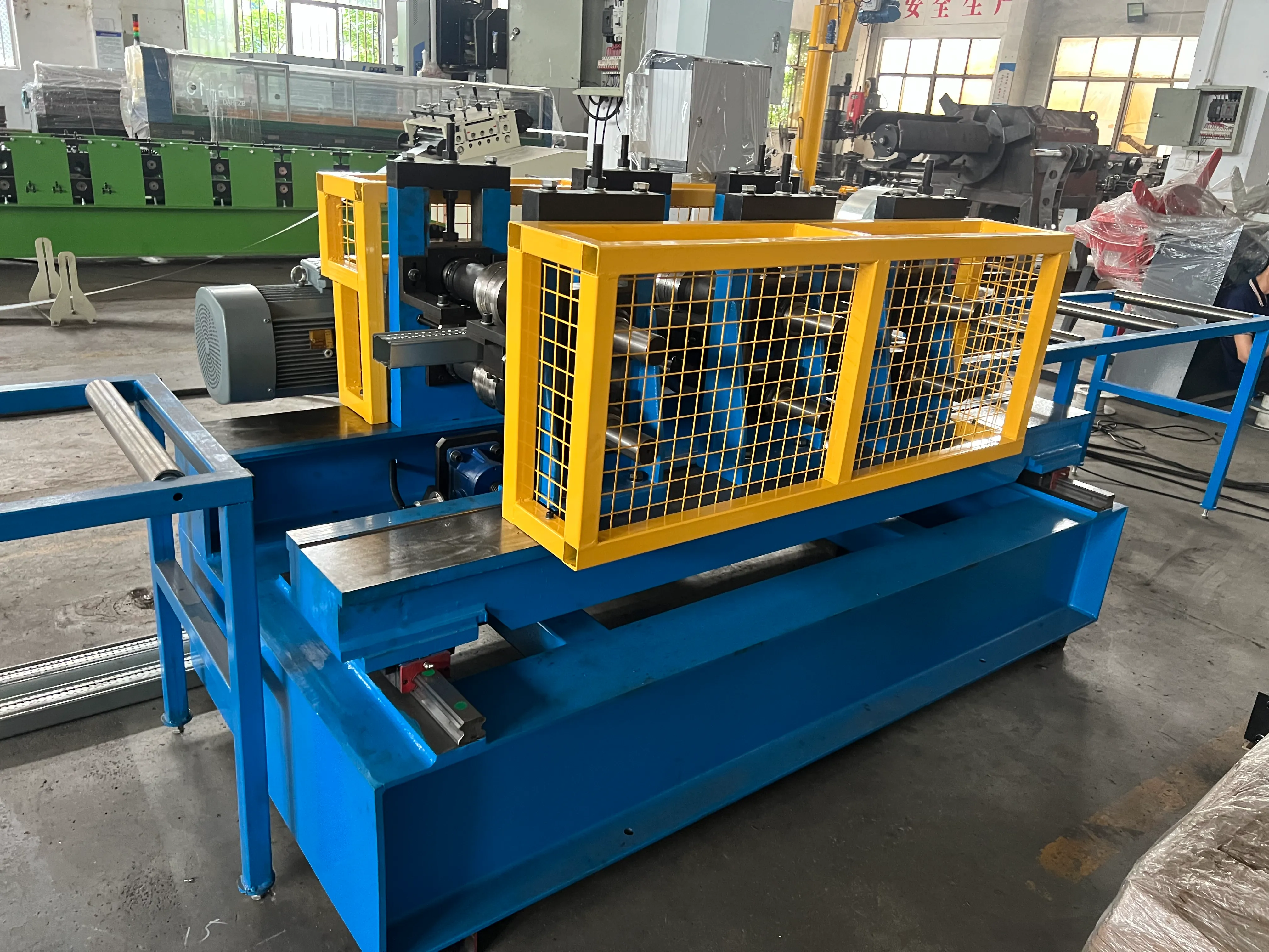 Roll Forming the C-Channel: The punched flat strip then enters the roll forming machine. This machine consists of a series of tandem stations, each with a set of hardened steel rollers. Each station makes a small, incremental bend. Over the course of 12 to 20 stations, the flat strip is gradually and precisely shaped into a uniform C-channel profile. This C-channel already has the basic shape and all the necessary holes of the final upright.