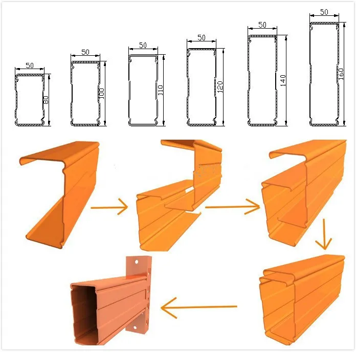 A racking vertical box beam, often called an upright frame or column, is the vertical structural member in a pallet racking system. It is not a solid beam but a hollow, rectangular or square tubular section, typically manufactured from high-strength steel. These uprights are characterized by a series of precisely punched holes or slots along their height, which allow for the adjustable insertion of the horizontal load beams that support the pallets.